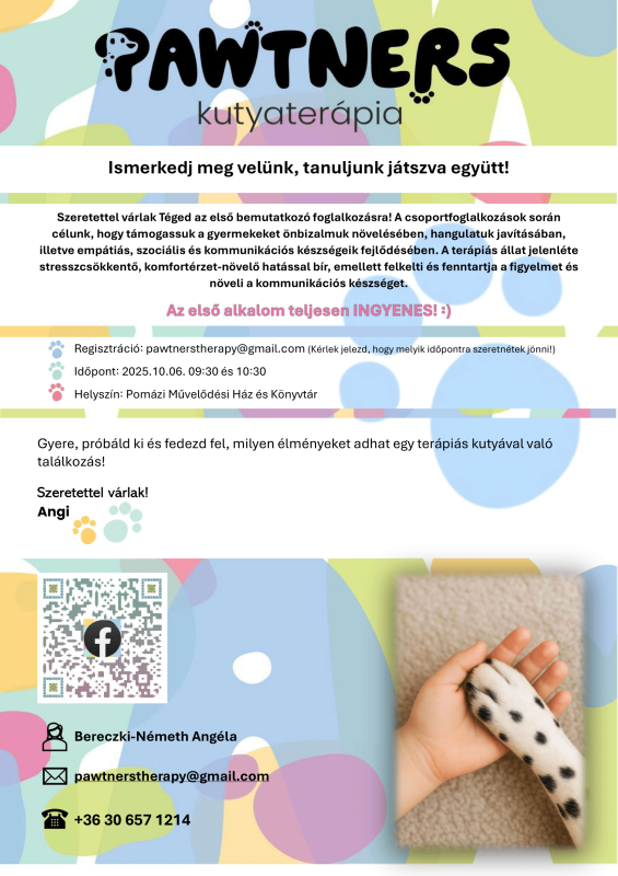 Játékos, fejlesztő foglalkozások, amelyeken a terápiás kutya motivációs szerepet tölt be. Az ő segítségével gyakoroljuk pl. a színeket, évszakokat, számokat, mondókákat, a korosztálynak megfelelően.