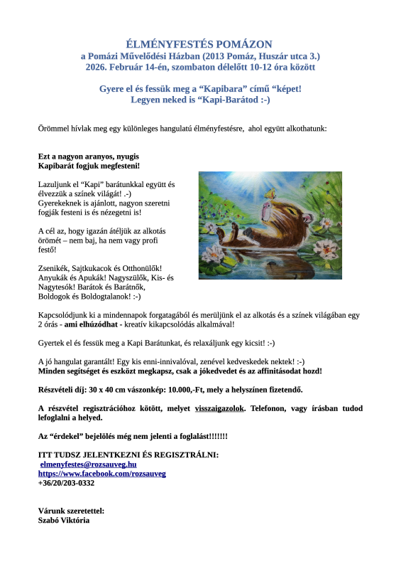 A részvétel regisztrációhoz kötött, melyet visszaigazolok. Telefonon, vagy írásban tudod lefoglalni a helyed.