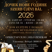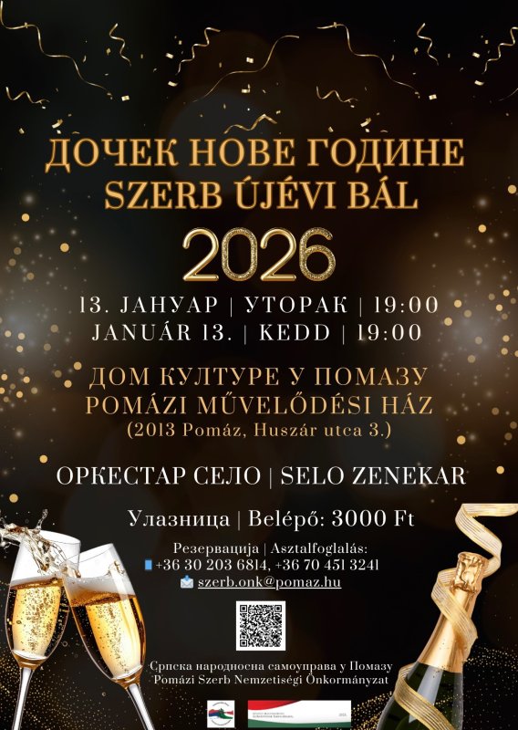 Szerb Szilveszteri Bál 2026. Időpont: 2026. január 13. 19:00 Helyszín: PMHK - Színházterem Belépő: 3.000 Ft Asztalfoglalás: +36302036814 +36704513241 szerb.onk@pomaz.hu További információk: szerb.onk@pomaz.hu