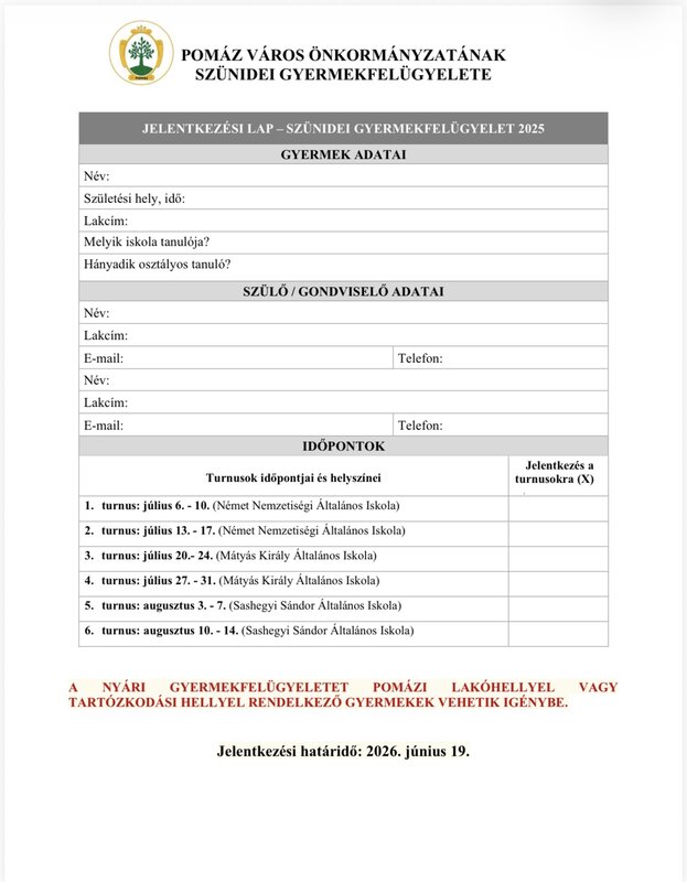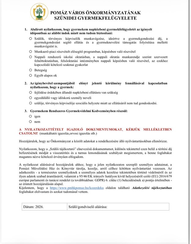 Aki nem csatol igazolást a jelentkezési lap mellé, az legkésőbb június 27-ig küldje meg nekünk a nyarigyermekfelugyeletpomaz@gmail.com email címre, vagy hozza be személyesen a művelődési házba. (2013 Pomáz, Huszár utca 3.) A jelentkezéseket kizárólag hiánytalan dokumentáció esetén tudjuk elfogadni!