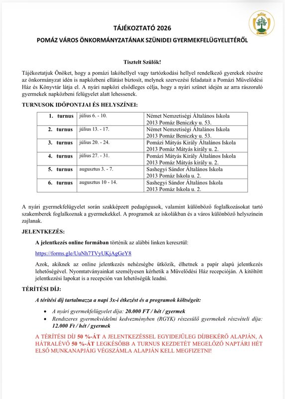 Tájékoztatjuk Önöket, hogy a pomázi lakóhellyel vagy tartózkodási hellyel rendelkező gyerekek részére az önkormányzat idén is napközbeni ellátást biztosít, melynek szervezési feladatait a Pomázi Művelődési Ház és Könyvtár látja el. A nyári napközi elsődleges célja, hogy a nyári szünet idején az arra rászoruló gyermekek napközbeni felügyelet alatt lehessenek.
