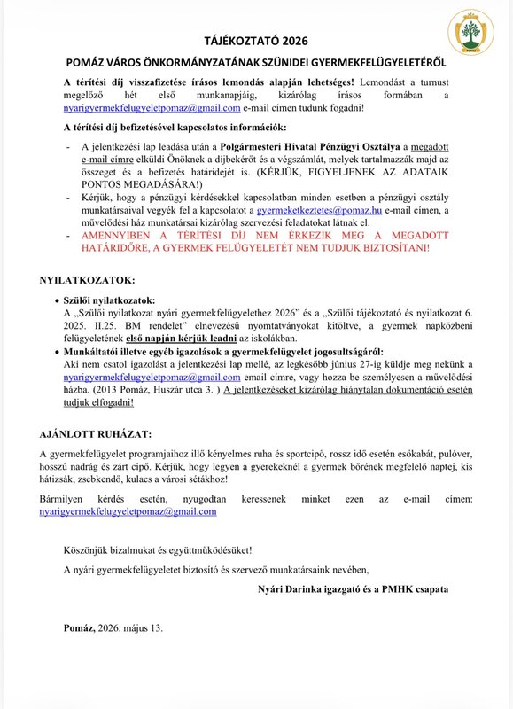 Bármilyen kérdés esetén, nyugodtan keressenek minket ezen az e-mail címen: nyarigyermekfelugyeletpomaz@gmail.com