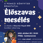 Csiki Lóránt népmesemondó érkezik hozzánk! Időpont: 2025. október 8. 10:00 Helyszín: Pomázi Művwlődési Ház és Könyvtár - Színházterem Ünnepeljük a népmese napját! A program a Könyvtári Napok 2025 keretében valósul meg.